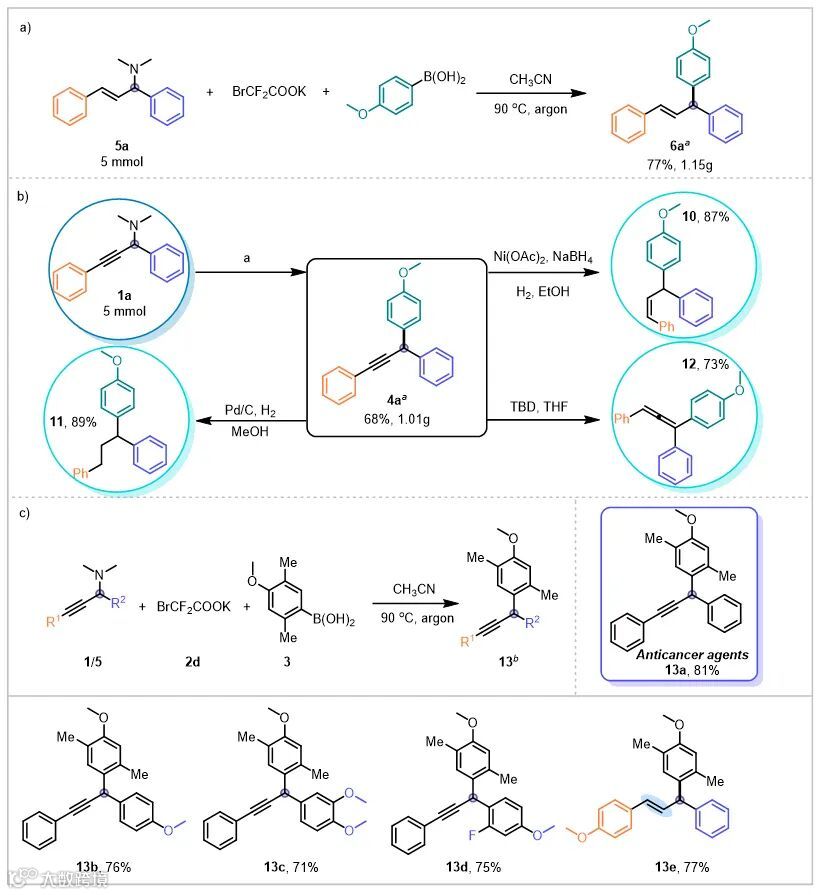 随后,克级放大反应以及对产物的后期转化都能顺利进行,并且应用该方法能够实现抗癌药物小分子的快速合成,进一步说明了该反应的实用性(图6C,