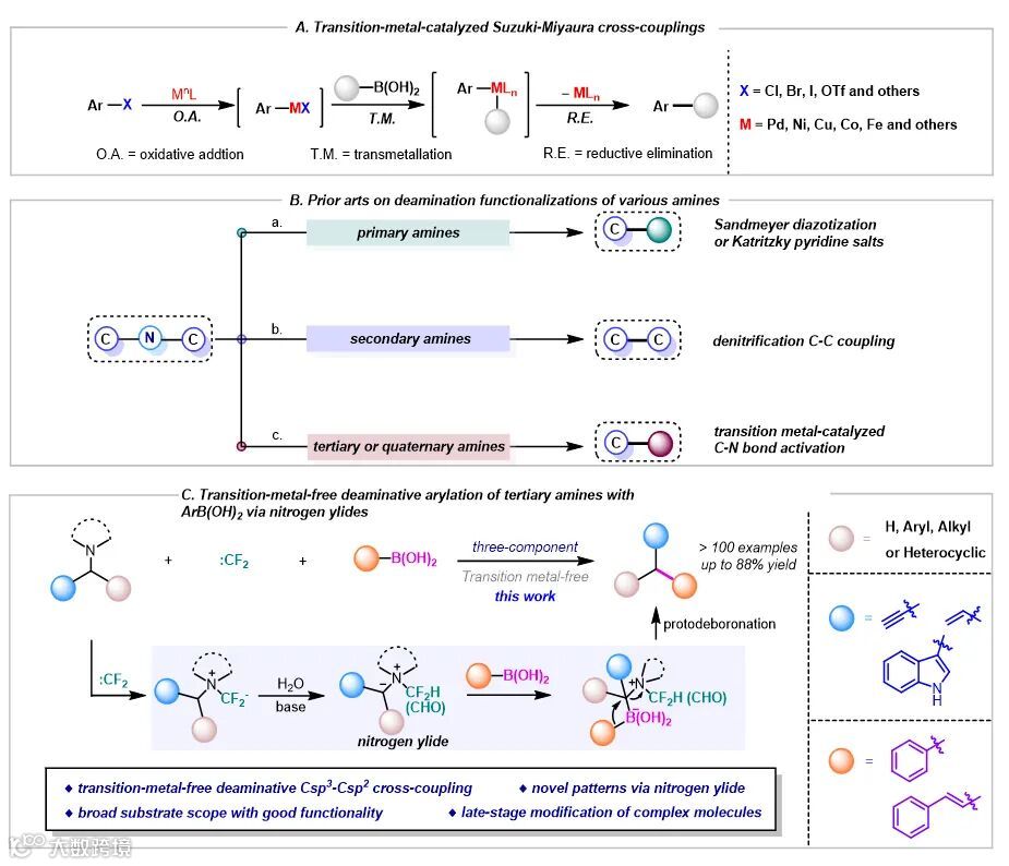【有机】宋秋玲教授课题组Angew:二氟卡宾促进的无过渡金属参与的三组分叔胺化合物的脱胺Suzuki偶联反应