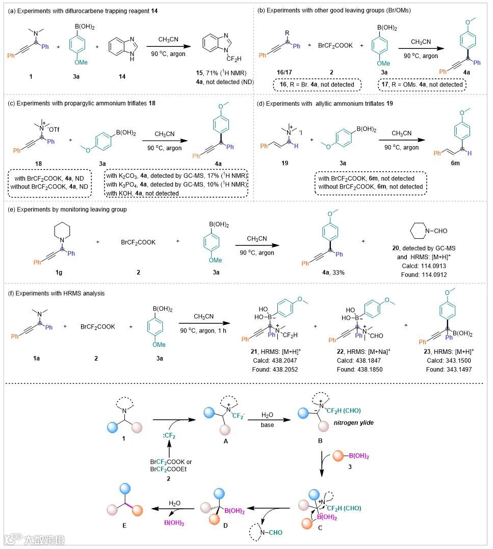 与以往不同的是,之前二氟卡宾对三级胺活化之后,都是对胺进行后期修饰,得到一些重要的含胺骨架类化合物。该策略代表了一种全新的反应模式,其通过由叔胺和二氟卡宾原位形成的氮叶立德与芳基/烯基硼酸作用成功地构建了