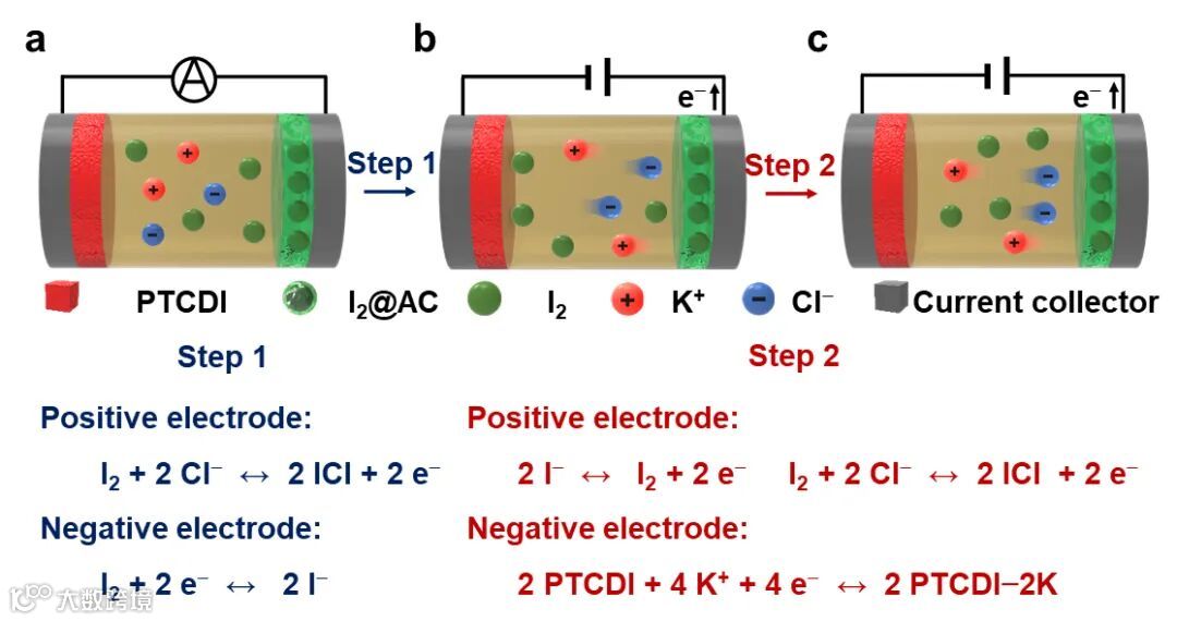 这篇研究工作首次提出了水系有机负极||I2串联电池的概念(图1)。与之前报道的水系金属负极||I2和H2||I2电池体系不同,该文采用3,4,9,10-苝四甲酰二亚胺(PTCDI)作为负极的活性材料和饱和KCl/I2混合溶液作为电解液。这些成分的使用可以在一个电化学储能装置中实现两个可逆电化学反应的接续发生。当以活性炭包覆的碘单质为正极材料组装成全电池后,电池体系可以在40 A g−1的电流密度下获得900 mAh g−1(以电极材料中的碘为基)的初始放电容量和1.25 V 的平均放电电压。此外,该文还报道了水系无正极碘基软包电池的组装和测试,该电池在80 mA的电流下经历900次循环后,放电容量仍能保持约70%。