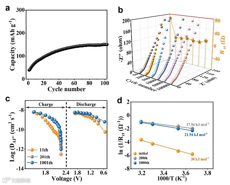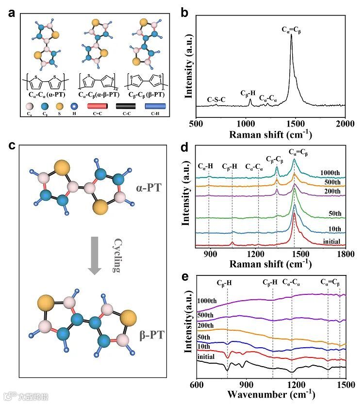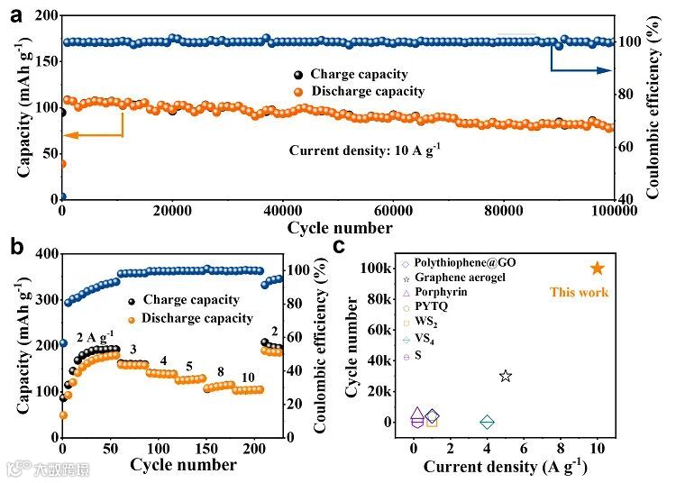 得益于自适应重构过程对聚噻吩电化学性能的改善。β-PT能在2 A g-1下提供190 mAh g-1的高比容量,并在10 A g-1下能稳定循环超过100,000次。
