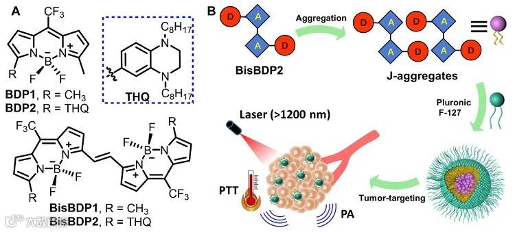 通过“J-聚集”策略首次实现了最大吸收超过1200 nm的氟硼吡咯类染料的构建。其中,BisBDP2 J-聚集体纳米粒子在NIR-II光声成像和深层肿瘤的光热治疗中都表现出较好的效果。