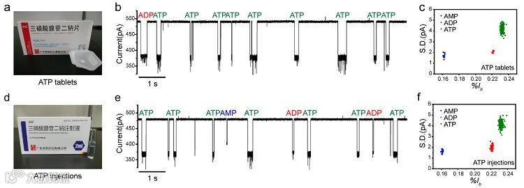天然核糖核苷酸作为人体必需的营养素广泛应用于制药行业。例如,ATP是治疗代谢紊乱和肌肉萎缩的一种重要临床药物,也是治疗慢性肝炎、冠心病、肾炎、脑动脉硬化的辅助药物。利用异质纳米孔技术,该研究团队成功在商用的ATP药物中检测到了微量的ADP和AMP杂质。该方法不需要复杂的样品预处理,同时具有较高的灵敏度和准确度。这表明这种传感策略能够直接鉴定混合物中不同磷酸化的核苷酸,为细胞内核苷酸代谢、核苷酸参与的酶促反应以及食品、药品中外源性核苷酸的快速检测提供了单分子分析