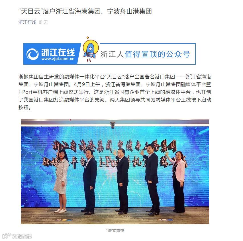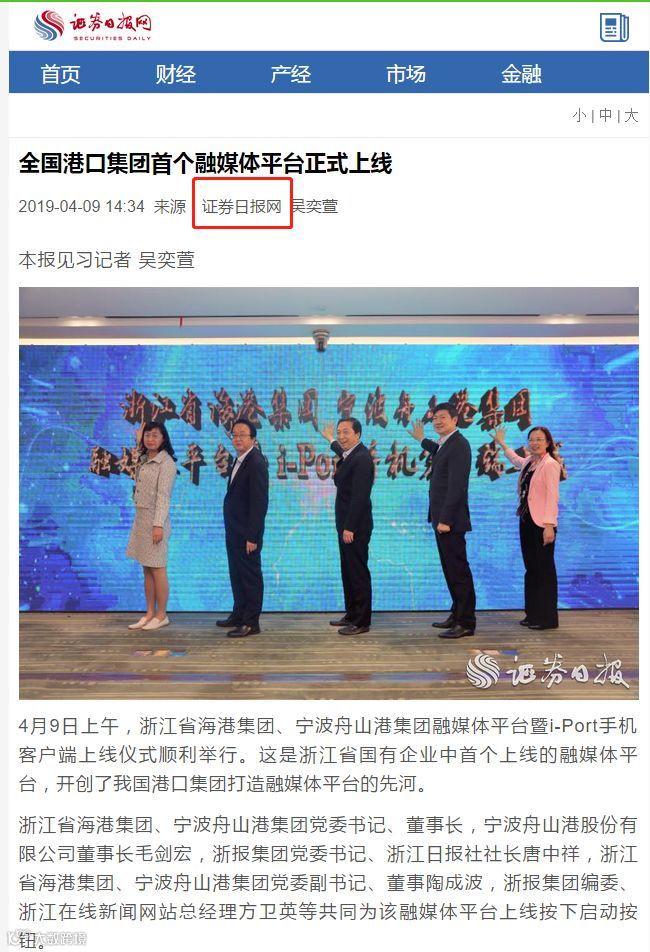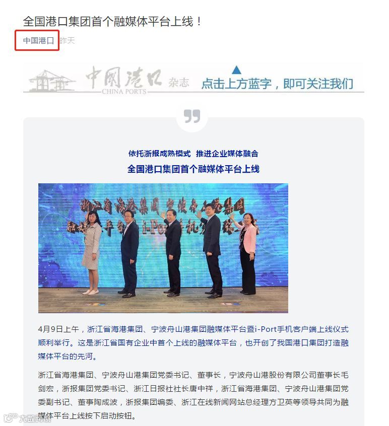 连日来,《浙江日报》、“中国港口”和“港口圈”微信公众号、《证券日报网》等多家主流和行业媒体聚焦了浙江省海港集团、宁波舟山港集团融媒体平台成功上线,这是浙江省国有企业中首个上线的融媒体平台,也开创了我国港口集团打造融媒体平台的先河。下面,咱们一起来看看吧!