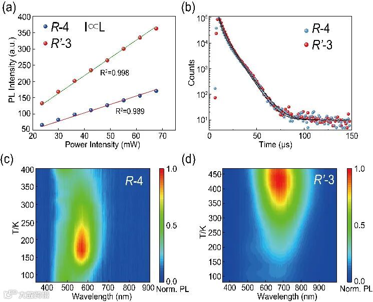 图4. 手性铟锑合金氯化物的时间分辨光谱、功率依赖发射光谱和变温光致发光光谱