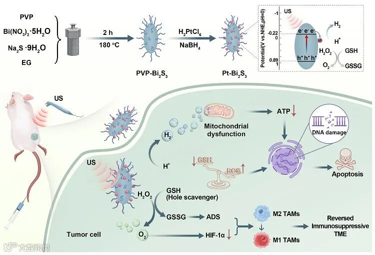 导读:中国科学院长春应用化学研究所林君/马平安研究团队与广东医科大学程子泳研究团队合作,首次提出声催化产氢的概念并将其定义为:US提供外部能量输入以激活声催化剂通过裂解水在肿瘤部位原位产氢。