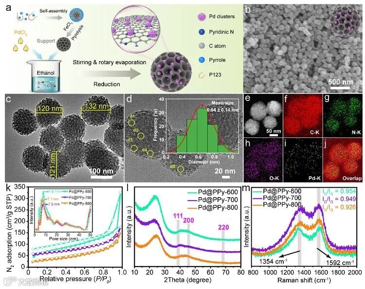 利用吡咯单体与三嵌段共聚物P123经过自组装、聚合以及热解过程精确制备了一系列均一的介孔氮掺杂碳纳米球作为载体来锚定Pd。