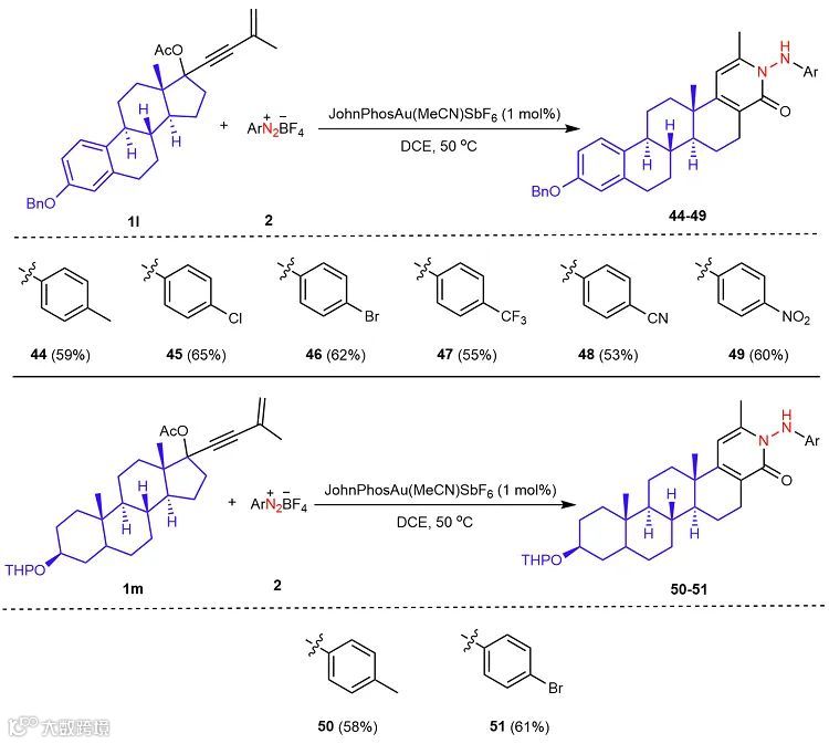 氮杂甾体类化合物常来自于类固醇化合物的化学修饰,是常用药物中一类特殊的药效基团。利用这一策略,作者成功将类固醇衍生的1,3-烯炔醋酸酯转化为氮杂甾体化合物,收率良好(图3)。