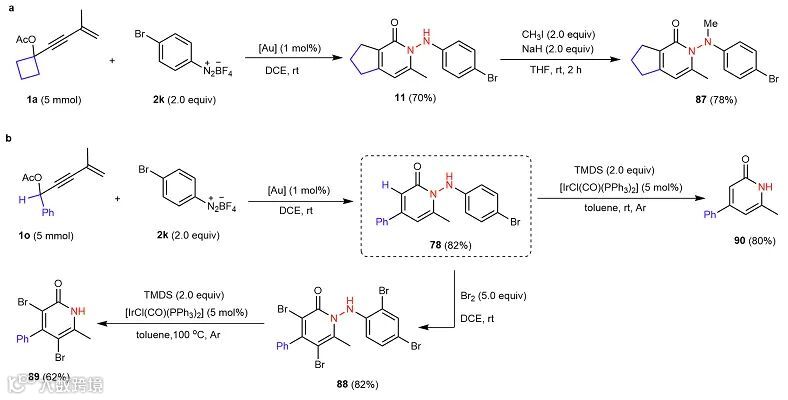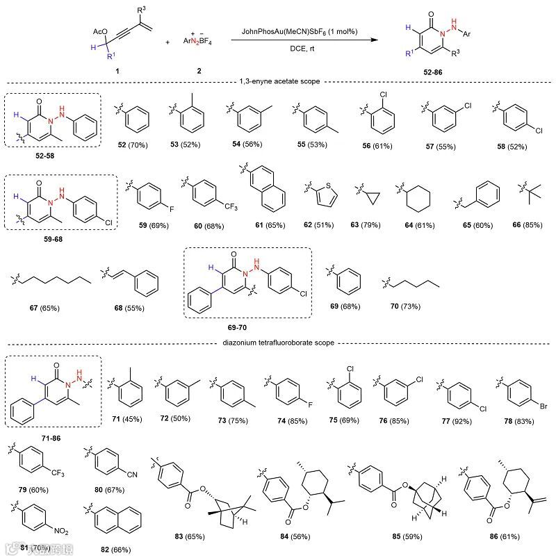 利用金催化1,3-烯炔醋酸酯环化原位形成的环戊二烯醋酸酯捕获芳基重氮盐正离子,形成偶氮中间体,经乙酰基迁移和氮插入过程,完成Schmidt反应,实现了高附加值2-吡啶酮类化合物的高效合成