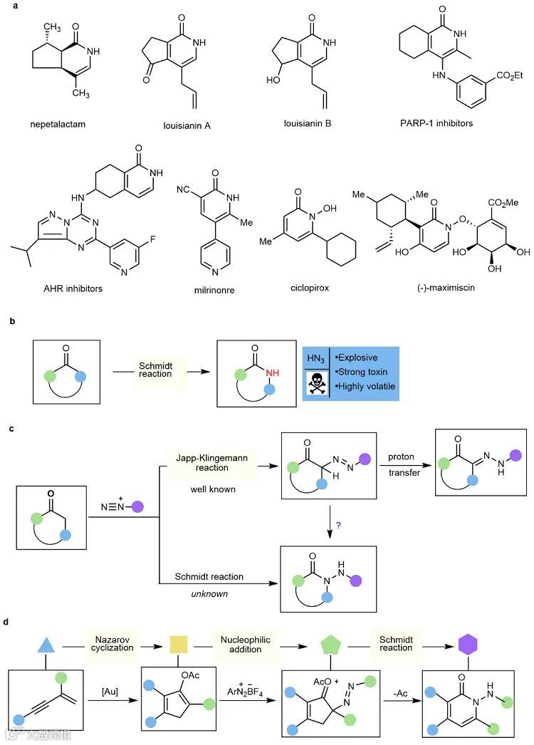 2-吡啶酮骨架是构成许多天然产物的基本结构单元,呈现出广谱的生物活性,在药物研发和医学化学等研究领域都具有重要的研究价值(图1a)。因此,开发高效的2-吡啶酮合成方法成为有机合成领域中重要的研究目标之一。另一方面,Schmidt反应是一类能使醛、酮类化合物发生重排/胺化反应生成腈和酰胺衍生物的有效方法,但此反应常使用具有强挥发性、高毒性和易爆炸性的叠氮化物作为氮源,严重限制了其在药物化学及精细化工品化学等领域中的应用和推广(图1b)。因此,寻找低毒、安全的氮源成为开发Schmidt反应首要解决的难题。2020年,