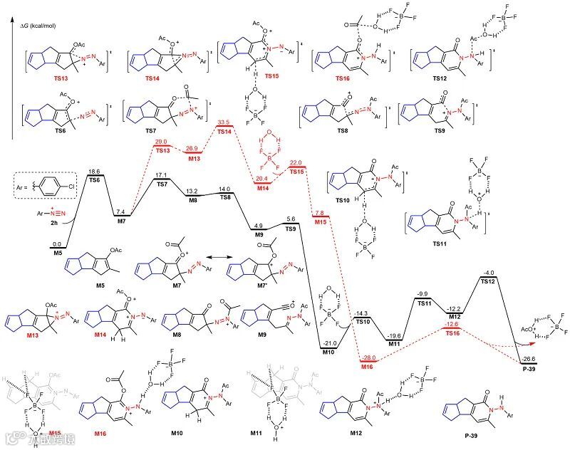 大学课题组对这一过程进行了系统的DFT理论计算,详细地解释了偶氮芳烃活化引发Schmidt反应的诱因及最优反应路径。计算发现:环张力控制非对称环酮衍生的1,3-烯醋酸酯的C-C键迁移的区域选择性(图6和7);其次,偶氮芳烃的弱亲核性诱导酰基迁移引发了Schmidt反应,这一过程仅需克服9.7 kcal/mol的活化自由能,而另一种氮插入扩环过程需要克服26.1 kcal/mol的活化自由能,因此,基本上排除这一过程的可能性(图8)。