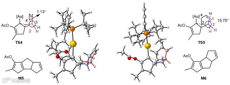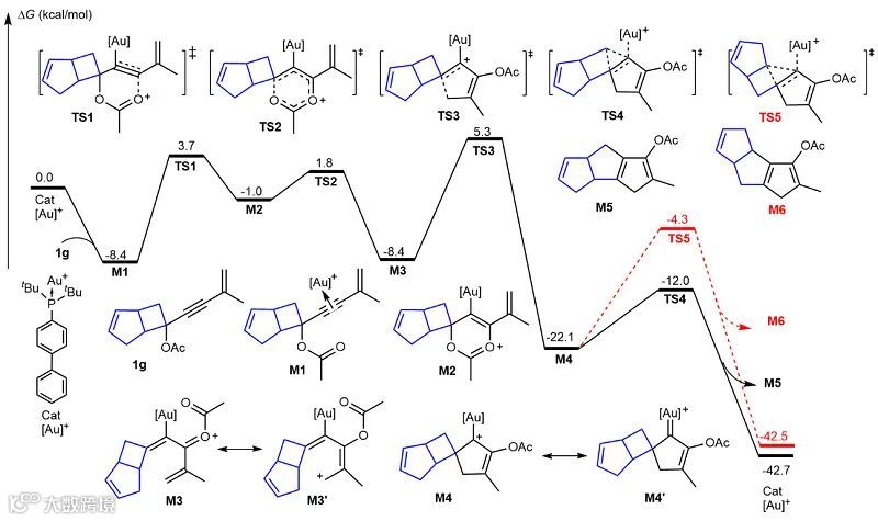 图6. Au(I)催化的1,3-烯炔醋酸酯环化反应的吉布斯自由能剖面图