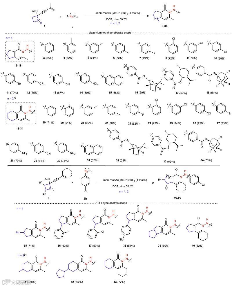 导读:江苏师范大学屠树江、姜波、郝文娟研究团队在前期的工作基础上提出了“偶氮芳烃活化”策略,即利用金催化1,3-烯炔醋酸酯环化原位形成的环戊二烯醋酸酯捕获芳基重氮盐正离子,形成偶氮中间体