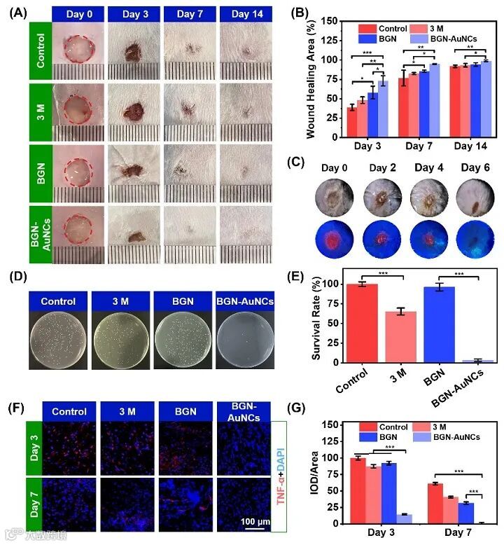 图4. BGN-AuNCs促感染性伤口愈合能力(A-B)、伤口荧光检测功能(C)、体内抗菌性能(D-E)及下调炎症水平功效(F-G)