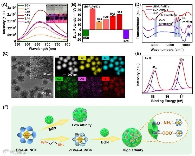 图1. BGN-AuNCs的表征(A-E)及合成策略(F)