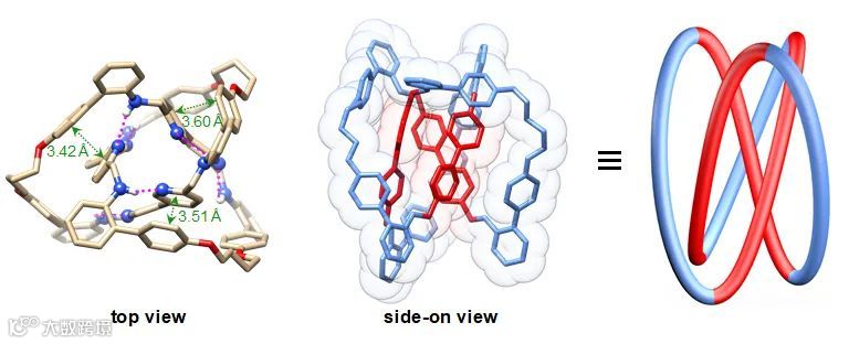 然后,作者将TK4进行还原脱金属化后经过分离提纯,以75%的产率得到纯有机的三叶结TK4D。通过高分辨质谱和1H NMR以及单晶结构确认其拓扑分子结构(如图4),TK4D通过分子内六重氢键以及三重[π∙∙∙π]相互作用很好地稳定了该结构。