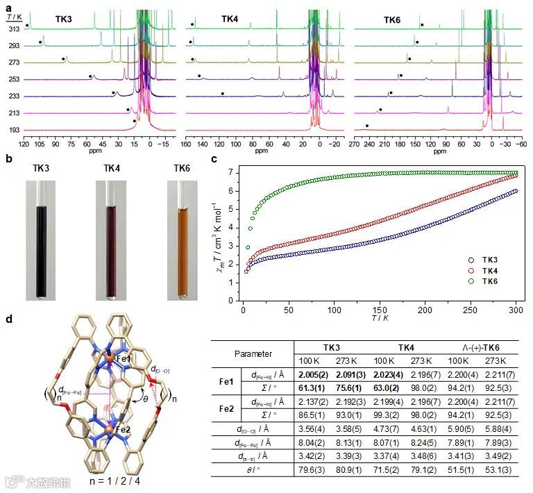 图5.(a)变温核磁;(b)晶体溶液的颜色;(c)变温磁化率曲线;(d)变温单晶的键长和键角参数变化