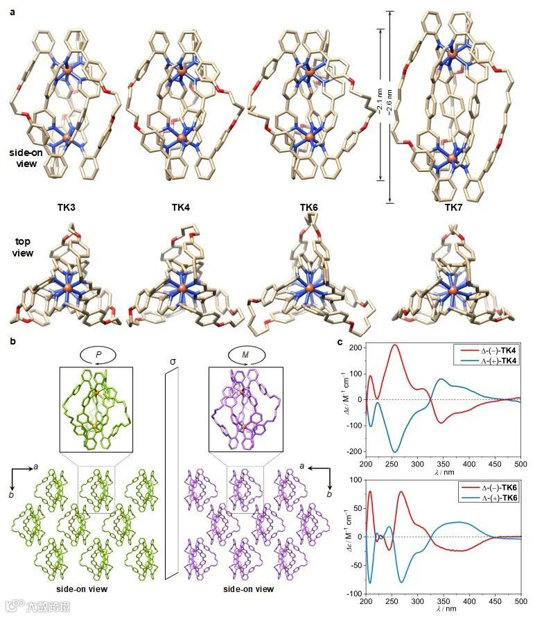 通过将异丙醚缓慢扩散至TK3、TK4和TK6的乙腈溶液和TK7的硝基甲烷溶液中,作者获得了TK3、TK4、TK6和TK7的晶体结构(如图3a)。这四种晶体结构呈现出D3对称的拉伸纺锤状三叶结拓扑结构与起初设计思路相吻合。TK3、TK4、TK7的晶胞单元中存在一对拓扑手性相反的对映异构体。于是,作者利用手性HPLC成功将TK4的对映异构体拆分开,并用CD光谱证明其光学纯度(如图3c)。作者进一步发现,TK6发生了手性自分类现象(如图3b)。于是,借助单晶X-射线衍射技术成功将TK6的两种光学纯的单晶进行了手动分离,其光学纯度用CD光谱得以证明(如图3c),进而证明TK6的绝对构型分别为Δ-(−)-TK6和Λ-(+)-TK6。