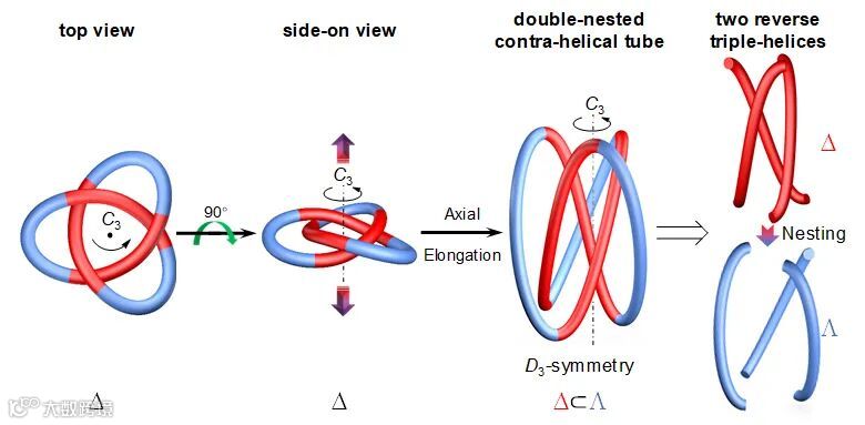 目前合成分子三叶结比较成熟的方法主要有Sauvage开发的线性双螺旋策略和Leigh发展的圆形螺旋策略。本文中作者另辟蹊径,开发了一种新颖的基于多股(>2)线性螺旋的嵌套反螺旋策略来构建通常的环结分子。该策略如下:沿C3对称轴拉长环面右手螺旋(Δ)三叶结会形成管状右手螺旋三叶结(如图1),外层则用更大的左手螺旋手性(Λ)同轴嵌套连接起来。同理,环面 Δ-Solomon link可以由双嵌套Δ⊂Λ-四重螺旋管连接实现。因此,这种基于嵌套反螺旋的普适性策略可以利用连接体在内核和外核之间通过适当的同轴嵌套一步实现,或者通过预组织先形成内核多股螺旋,然后使用相反螺旋手性的连接体将每条链的外侧顶端与另一条不相邻链的底端连接起来即可。考虑到金属模板已被证实在合成多链螺旋中的通用性,因此,金属模板多股螺旋可以作为构建模块有效地实现该策略。本文中作者介绍的“嵌套反螺旋”方法中,仅通过两个金属模板离子即可构建多股金属螺旋。