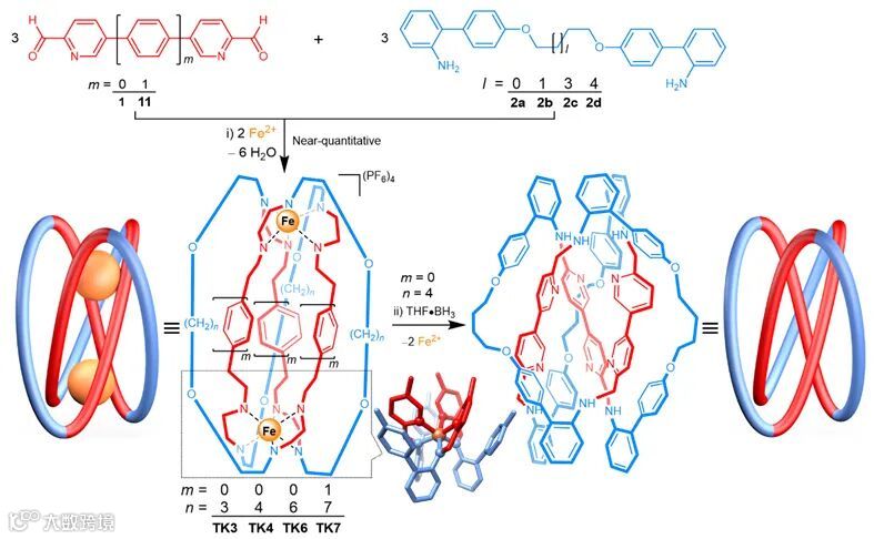 通过精心设计,作者将3当量的3,3'-联吡啶-6,6'-二甲醛(化合物1)与3当量具有不同烷基链长度(C3, C4, C6)的联苯二胺(2a, 2b, 2c)在3当量Fe(OTf)2模板的诱导下利用动态共价化学于乙腈中反应24小时即可以分别得到TK3(深蓝色)、TK4(深红色)、TK6(橘红色)。为了进一步验证该策略的通用性,作者又利用对亚苯基间隔的二吡啶二甲醛(化合物11)与具有C7烷基链的联苯二胺(2d)反应,同样以高产率得到TK7(如图2),它也是迄今为止合成的最长的三叶结(111个原子长度构成的长约11 nm的闭环结构)。