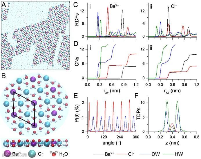 图2. 纳米孔隙内单层碱土金属氯化物BaCl2·6H2O水合盐的结构特性。