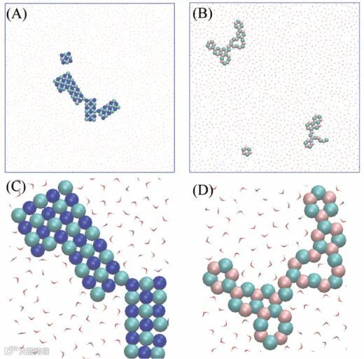 图1. 纳米孔隙内单层碱金属氯化物NaCl(A,C)和LiCl(B,D)离子晶体的分子动力学模拟快照。