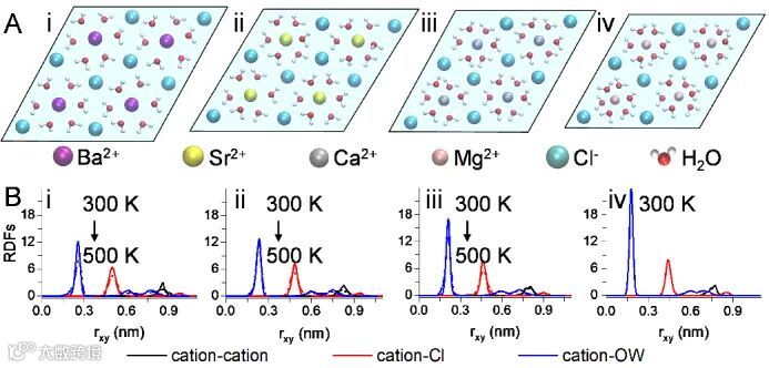 目前,科学家已经发现火星的沉积层内存在数量众多的硫酸镁水合盐(MgSO4·nH2O),从而证实了这个红色星球早期存在水。在这个工作中,团队通过经典分子动力学和第一性原理分子动力学模拟证明,该种单层水合盐在高温下保持稳定存在(500 K)。此结果为在高温行星上寻找水的存在提供了新思路。该研究进一步加深了对纳米限域环境内离子水溶液的结构和动力学行为的理解,为开发利用纳米多孔材料在离子输运、海水淡化及离子电池等应用方面提供一定的理论支持。