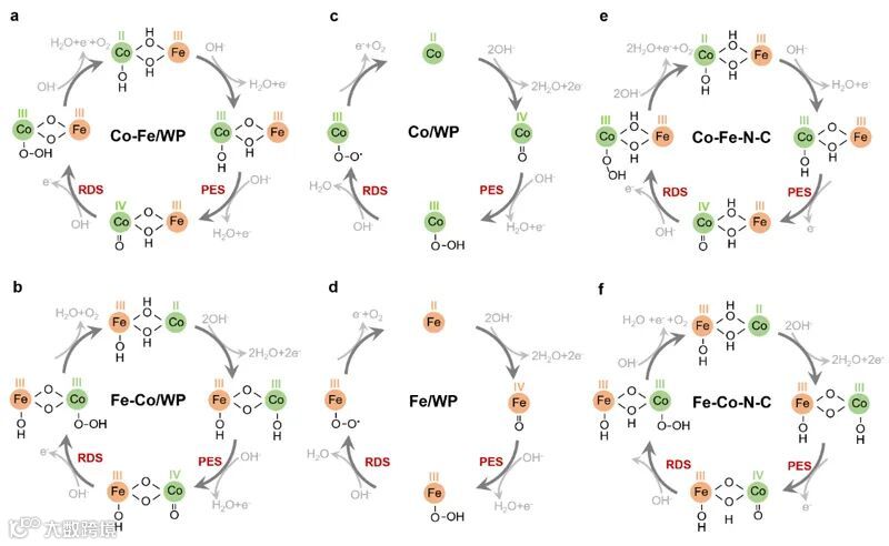 图2. 所研究的各个材料上的OER机理。(a) Co-Fe/WP, (b) Fe-Co/WP, (c) Co/WP, (d) Fe/WP, (e) Co-Fe-N-C 和 (f) Fe-Co-N-C。