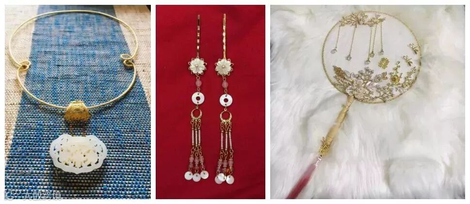 图中的团扇是前不久我为好友的婚礼所做,看到她拿着团扇开心的样子,我也觉得十分满足。“攘袖见素手,皓腕约金环,头上金爵钗,腰佩翠琅干。”古代的饰品还有许多,希望你能够喜欢我的这些作品。
