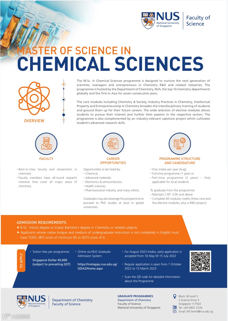 导读:新加坡国立大学化学系推出全新的一年制化学科学硕士项目(Master of Science in Chemical Sciences)