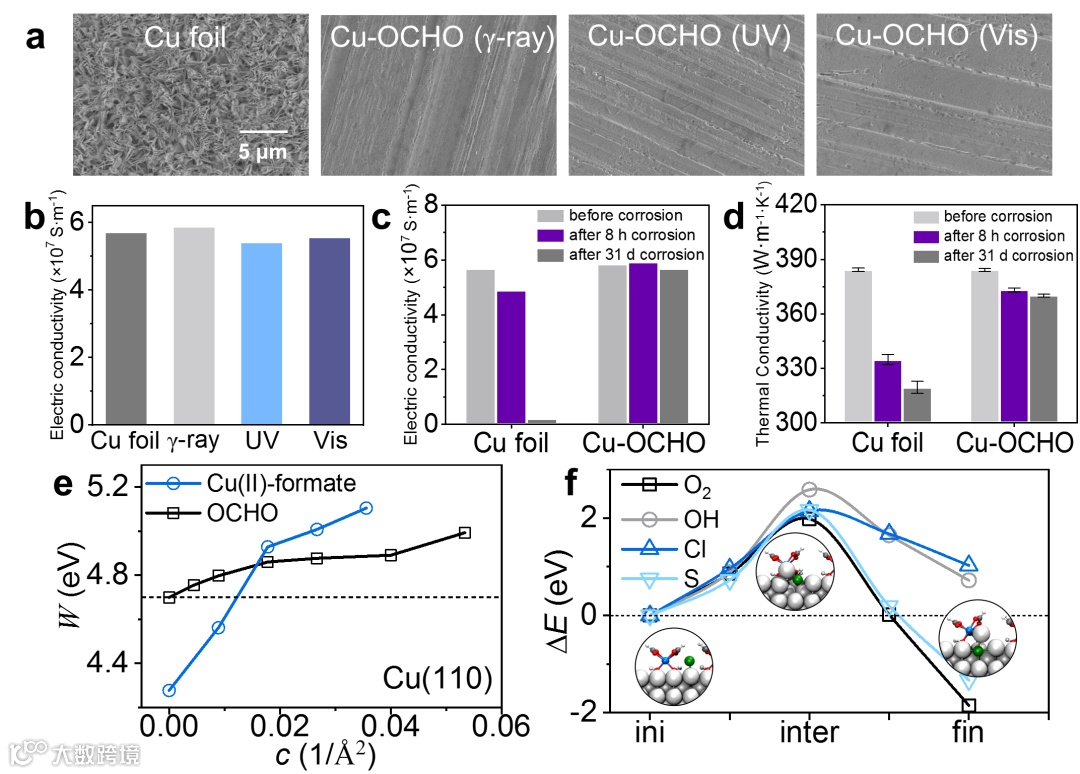 光诱导防腐策略能有效提高铜材料在盐碱等多种腐蚀环境的抗氧化性,且不会影响其本征导热与导电性能。对比未处理铜材料,各种光源下制备的防腐铜均能在碱性环境(pH 13)中保持表面金属光泽,微观形貌中也没有观察到氧化物的形成(图3a)。更重要的是,在碱性环境下(pH 13)腐蚀31天后,光诱导防腐铜的电导率仍保持在5.5 × 107 S m-1左右,导热系数保持在383 W m-1 K-1,体现了防腐层优异的结构稳定性(图3c-d)。理论模拟也验证了CO2–•与铜表面之间的强配位作用将阻碍各种腐蚀物种(O2、OH-、Cl-、S2-)向铜表面的扩散和进一步反应,表明光诱导CO2–•在铜表面具有很强的防腐性能和化学稳定性。