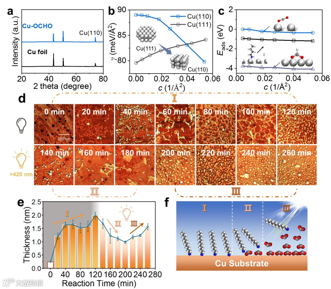 与甲酸钠钝化类似,光诱导防腐的铜表面重构被首先观察到(图2a),单晶对比实验和理论计算也证实十二胺在Cu(110)重构中具有重要意义(图2b)。为深入阐释防腐机理,研究团队采用原子力显微镜追踪反应过程中铜表面形貌变化。光照前后铜表面层发生明显变化,表面高度从1.98 nm先降低后升高。第一性原理计算发现CO2–•在铜表面的吸附能约比十二胺低2.8 eV(图2c-e)。上述结果说明,光诱导过程中,光照形成的CO2–•逐渐取代光照前铜表面重构所吸附的十二胺,并最终形成较为致密的防腐层。