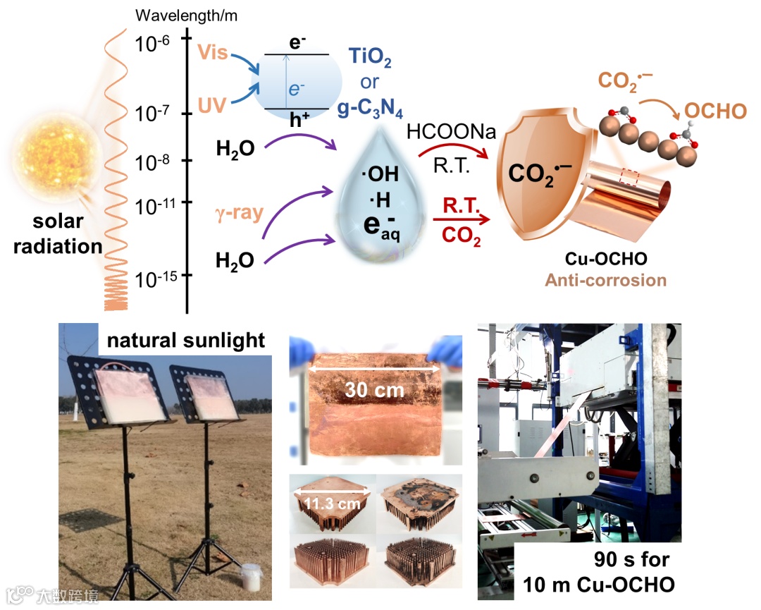 近日,受甲酸根钝化防腐技术的启发,南京航空航天大学马骏团队与郭万林团队合作提出一种光诱导二氧化碳自由基(CO2–•)在铜表面构筑防腐层的新思路。如图1所示,该防腐策略基于CO2–•与铜之间形成的强配位结构,结合自由基产生的普适性,将光诱导防腐过程扩展至可见光、紫外光、X射线和γ射线等多种应用场景。同时,该防腐策略可根据实际需求,利用工业电子束完成防腐铜材的大批量快速制备或利用自然光制备各种形状防腐铜材,实现太阳光为铜锻造二氧化碳防腐盾牌。