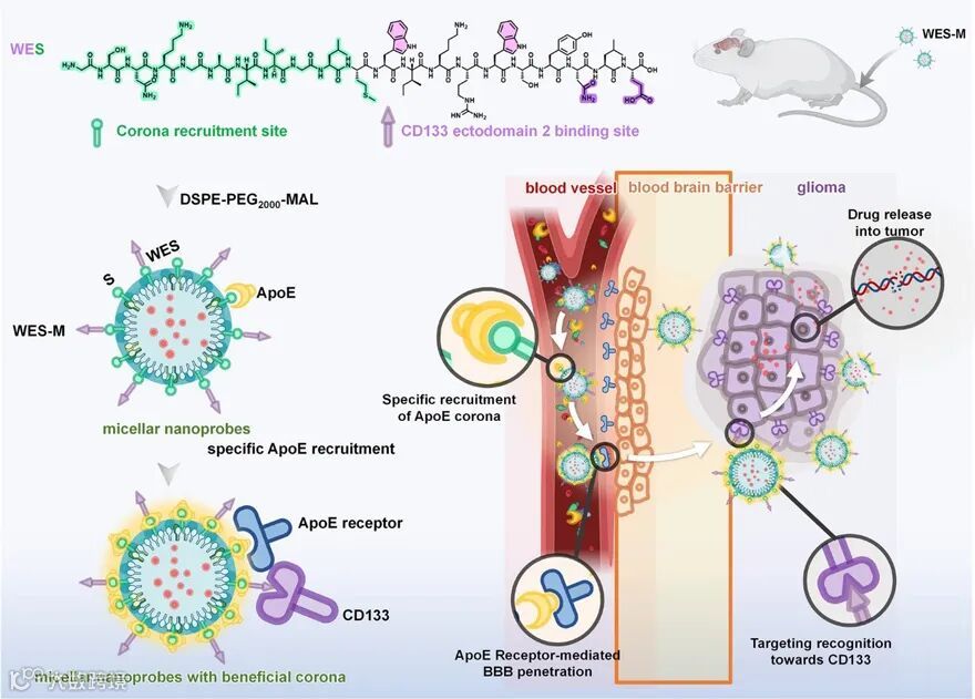 王蔚芝团队开发的级联胶束纳米探针对以上问题提出了新的研究思路。载脂蛋白E(ApoE)是一种血浆蛋白,主要在肝脏和脑组织中合成,具有指导脂质转运的功能。载脂蛋白可以与血脑屏障上过度表达的LDL(低密度脂蛋白)的特异性配体结合。因此,特异性招募ApoE 蛋白冠使得胶束探针可以通过受体介导的转胞吞作用 (RMT) 穿透血脑屏障并在循环中保持稳定。与此同时,CD133在胶质瘤的癌症干细胞(CSCs)中高表达,其靶向可用的细胞外结构域已被广泛认可。因此,本研究开发一款多肽修饰的级联胶束纳米探针,通过功能化分子调控实现了ApoE蛋白冠募集、血脑屏障穿透以及CD133靶向,从而实现肿瘤诊断和药物递送。