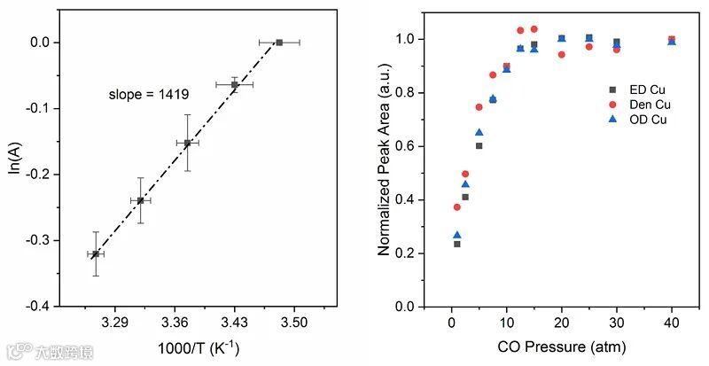 图2. 枝状铜归一化CO红外峰面积的对数随温度变化(左)不同铜材料归一化CO红外峰面积随CO分压变化(右)