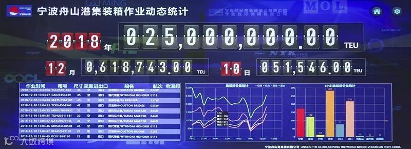 12月10日,随着宁波舟山港调度指挥中心数字化大屏上2018年生产数据跳跃上25000000,宁波舟山港年集装箱吞吐量首次突破2500万标准箱,实现历史性新跨越。