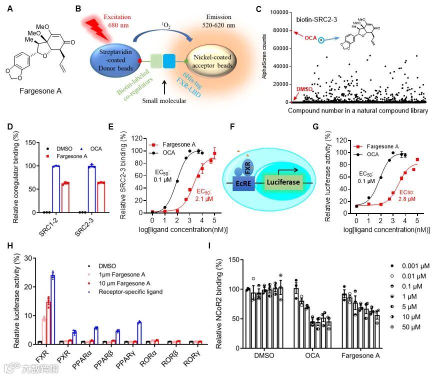 FXR的调节剂能够有效地调控FXR对辅调节因子的动态性募集和释放过程,利用这一特点设计了蛋白水平基于微珠的AlphaScreen高通量筛选体系,高效筛选了包含2700个天然产物的分子库,作者最终鉴定到来源于中药辛夷的天然产物Fargesone A是一种高亲和力的选择性FXR激动剂,能够在蛋白和细胞水平高效地激活FXR(图1)。