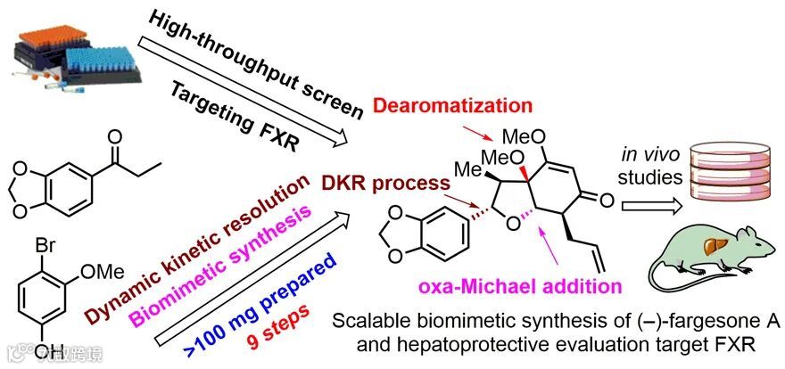 综上所述,作者通过高通量筛选发现了一种新型骨架的FXR天然产物激动剂Fargesone A,通过系列生物学活性测试证实了其作为FXR激动剂具有良好的保肝功效,并发展了其首条高效的不对称全合成路线(图3)。可以预期对Fargesone A进行成药性的衍生优化创造出具有优化结构的其他衍生物,将有可能为开发治疗FXR相关肝病的候选新药提供一种有效途径。