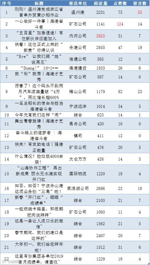 2019年2月份,“浙江海港”微信公众号录用基层单位稿件的传播数据新鲜出炉。最受读者关注的基层稿件有哪些呢?一起来看看吧!
