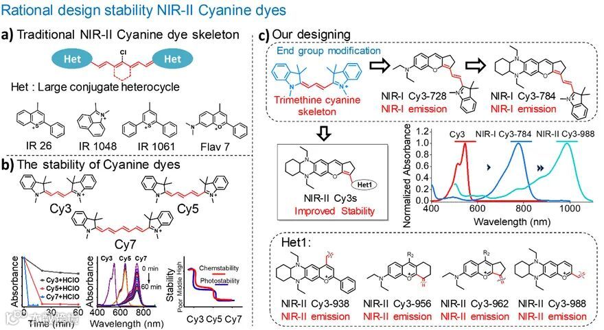 图1. a)常见的NIR-II区花菁染料;b)Cy3、Cy5和Cy7的稳定性研究;c)新型NIR-II区染料的设计途径