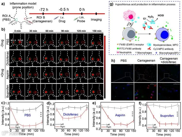 图4. 基于探针NIR-II Cy3-988的小鼠活体炎症及药物治疗过程中氧还原状态的监控