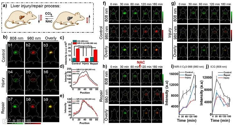 图5. 基于探针NIR-II Cy3-988的小鼠肝损伤及修复过程中氧化还原状态变化的可逆监测