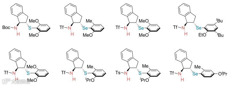 图1. 代表性的基于茚满骨架的手性芳基硫属化合物催化剂