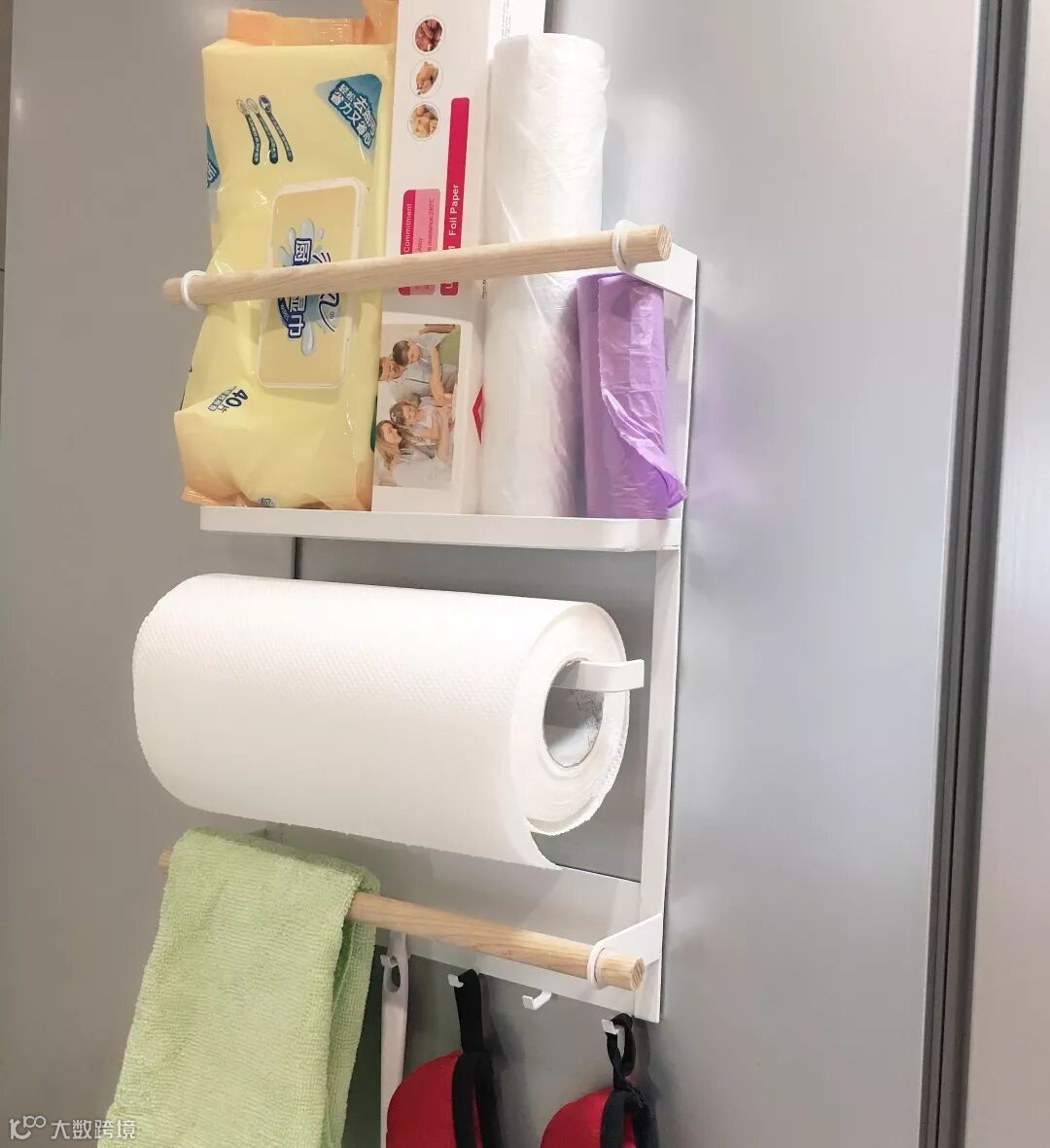 冰箱置物架内侧是磁铁吸附式,吸力强却不会损坏冰箱。家里冰箱外侧有空间的可以利用起来,打造视觉收纳小空间,放置随手常用小物件再好不过。