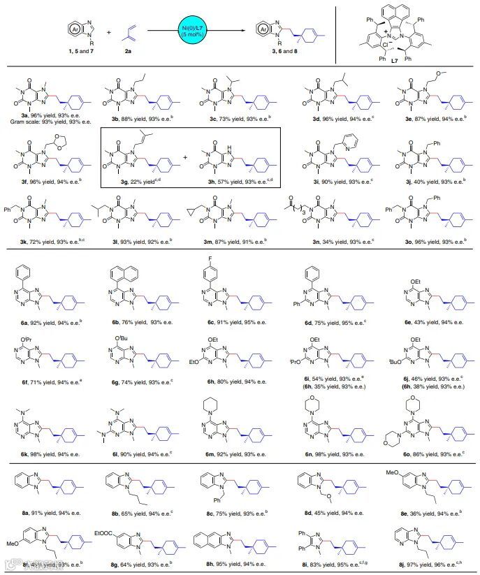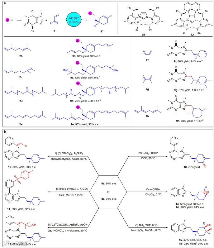 萜类化合物几乎存在于所有的生物体(如真菌、微生物、昆虫、海洋生物等)中并具有生理功能。在自然界中,萜类化合物的生物合成始于异戊烯基焦磷酸酯(IPP)和二甲基烯丙基焦磷酸酯(DMAPP),通过香叶基焦磷酸酯合酶(GPPase)缩合形成香叶基焦磷酸酯(GPP),GPP在酶催化下经关键中间体(香叶基正离子)生成相应的单萜烯和单萜类化合物(图1a)。尽管自然界已经进化了数百万年,但酶介导的碳正离子环化仅得到七个代表性的碳环骨架,再被进一步氧化和重排以产生其它单萜类化合物。因此,如何通过人工催化体系产生额外的单萜骨架至关重要,其中异戊二烯是生产萜烯和萜类化合物的重要前体。早在1967年,Smutny和Takahashi就报道了过渡金属催化的1,3-丁二烯与亲核试剂的调聚反应。随后,Beller、Finn、Réau、Navarro和 Carbó等人陆续开发了异戊二烯的亲核调聚反应以制备无环单萜(图1b)。尽管反应的区域选择性较好,但是从未研究过对映选择性调聚反应,同时异戊二烯的亲核环化调聚反应仍尚未开发。另一方面,杂环化合物(如嘌呤和咪唑)在药物分子和天然产物中也是极为重要的结构,化学家致力于研究这些化合物的官能团化,例如Ellman、Cavell、叶萌春、Ackermann和Cramer等人报道了Ni-催化简单烯烃的直接C-H键杂芳基化。将过渡金属催化的C-H键活化与异戊二烯的多样性转化与结合起来,就有可能为打开新的研究局面。