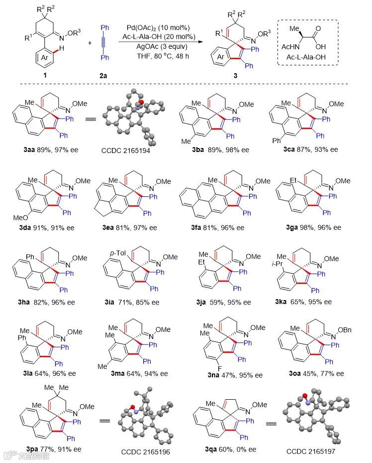经过系列反应参数的筛选和优化,最终能够以高达89%的产率和97%的对映选择性得到目标产物。在此基础上作者考察了底物肟醚的适用范围(图2)。研究发现,定向基、环己烯环、芳环连有不同取代基的底物均能顺利进行反应。肟基氮原子上的取代基对偶联反应的结果有较大影响,OMe的表现优于OBn。值得注意的是,环戊烯酮衍生的肟醚底物可以发生反应但只能得到消旋产物,由此可见,C-H活化步骤能够形成相对稳定的轴手性钯物种是取得高对映选择性的先决条件。在同样条件下,大多数对称结构的二芳基乙炔和非对称的苯丙炔均能发生螺环化反应。除此以外,作者还转向更具挑战性的开链结构肟醚底物的环化反应研究,以期合成非螺环结构的手性茚类化合物。作者对化合物