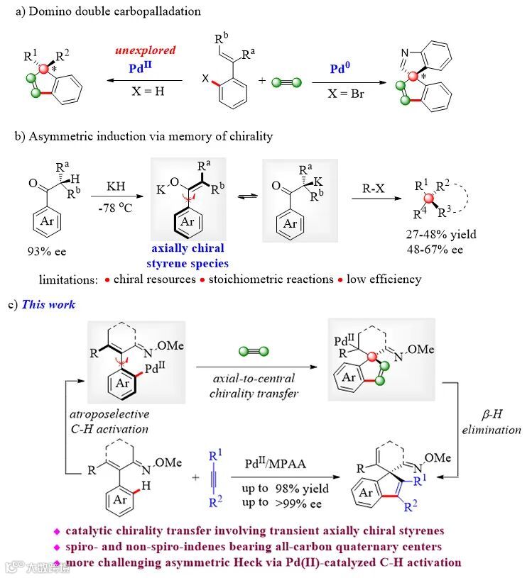 )-构型,与螺环产物构型相反。这是首例将轴手性苯乙烯结构金属中间体应用到催化手性转移过程的报道,为各种螺环和非螺环茚类化合物的合成奠定了基础,同时拓宽了季碳立体中心的构筑方法。