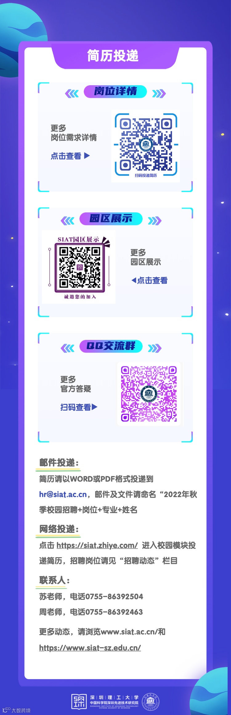 SIAT常年招聘多学科领域优秀人才,扫码可查看所有学科全部招聘岗位。