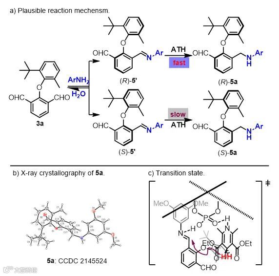 作者对该策略的可能催化机理进行了合理的解释(图6)。二醛和苯胺初步形成外消旋的亚胺中间体,R构型的亚胺可以在手性磷酸催化下快速发生氢转移反应得到目标构型的产物。而另一构型S型的亚胺则会发生水解,重新得到二醛。亚胺阻转能垒的DFT计算以及相关控制实验也表明,生成的亚胺不会在室温下发生构型的翻转,从而证明作者提出的机理的合理性。