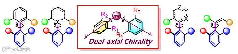 轴手性骨架是众多天然产物、优势手性配体和催化剂的核心结构单元,其高对映选择性构建已经成为不对称合成领域的研究热点,其中不对称有机小分子催化的轴手性构建发展尤其迅速。迄今为止,绝大多数的研究工作都集中于轴手性联二芳(杂)环、轴手性氮-芳环以及轴手性烯烃-芳环等单轴阻旋骨架的催化不对称构建。作为轴手性的延伸,当两个芳基通过两根化学键相连时,如果芳基位阻足够大,则仍然可以使分子旋转受阻而产生轴手性(图1)。这类化合物由于存在两根旋转轴,因此可以称之为“双轴”(Dual-axial Chirality)手性化合物。与分子内含有两个或多个轴手性元素的分子相比,“双轴”手性化合物的两根旋转轴需要与同一原子相连,所以导致其旋转能垒大大降低,构型稳定性减弱,高立体选择性构建存在很大挑战。